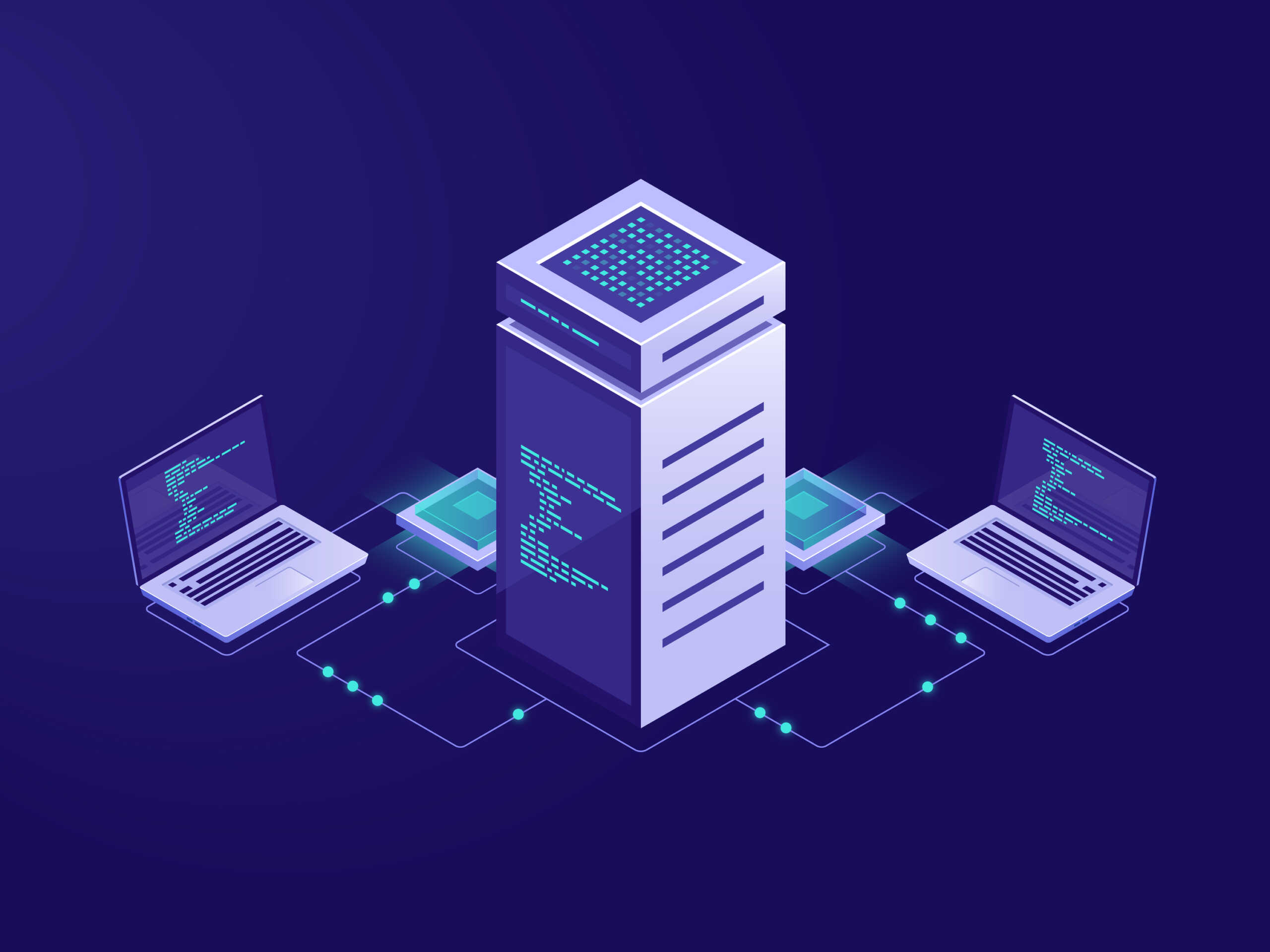 Big data processing concept, server room, blockchain technology token access, data center and database, network connection isometric illustration vector neon dark